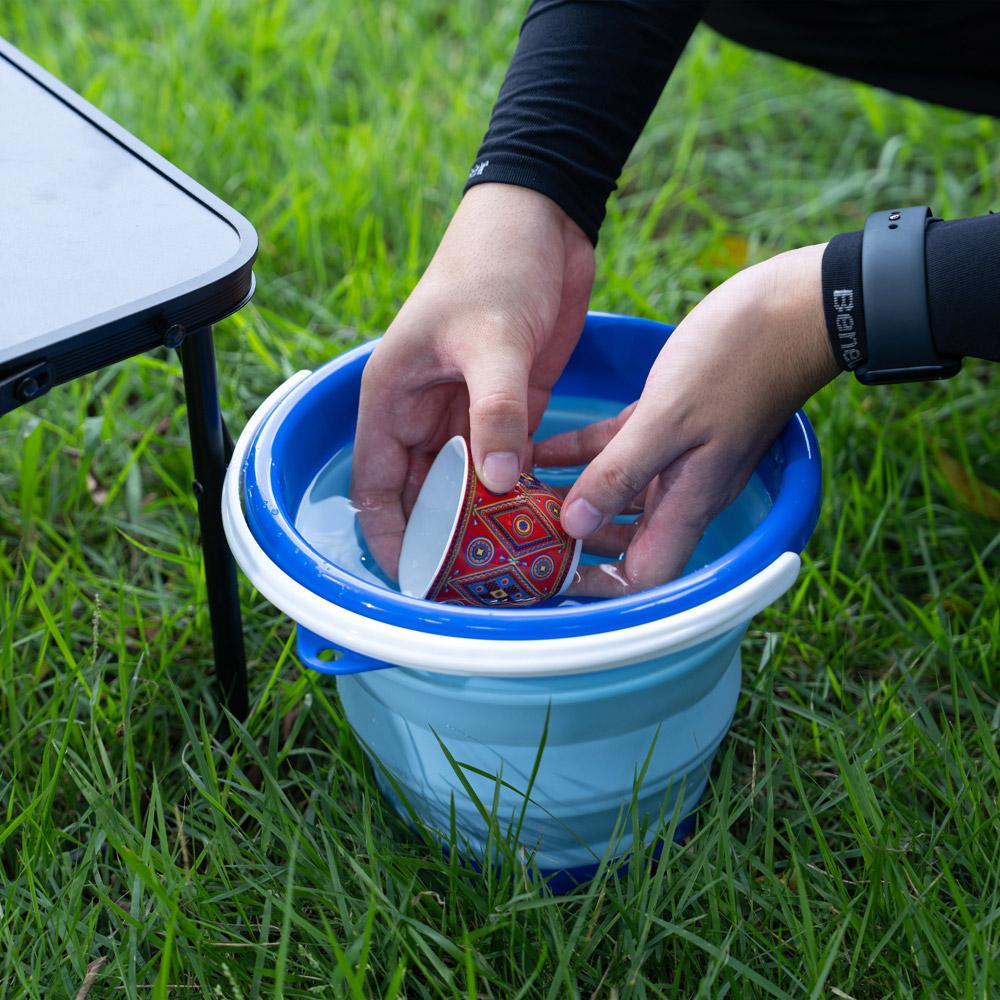دلو صغير الحجم ومرن، مثالي للاستخدام في الرحلات والتخييم، يجمع بين المتانة وسهولة الطي لتوفير مساحة تخزين مريحة.