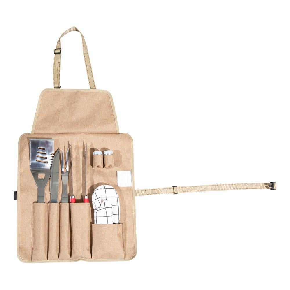 1. **Complete BBQ Tool Set: ** Consists of 7 pieces including tongs, spoon, fork, knife, 2 slotted spoons, and a glove.