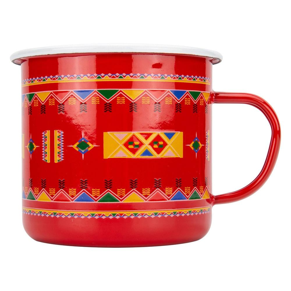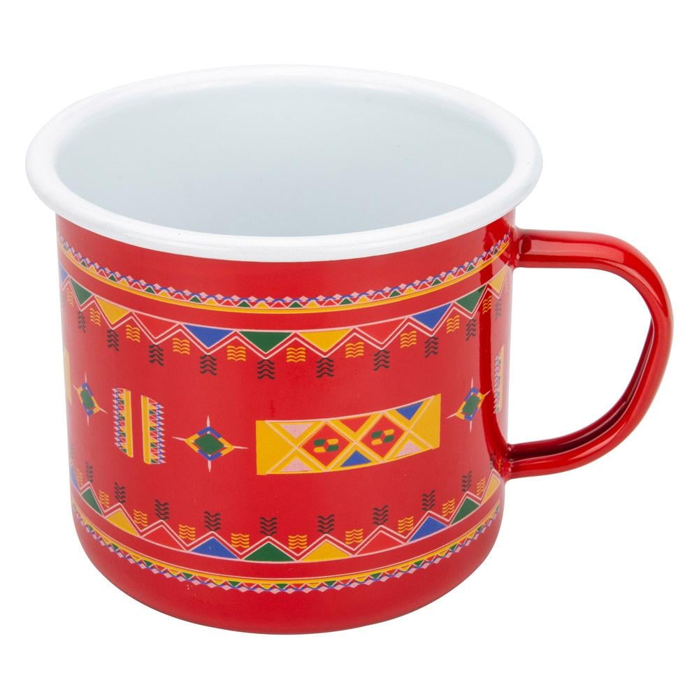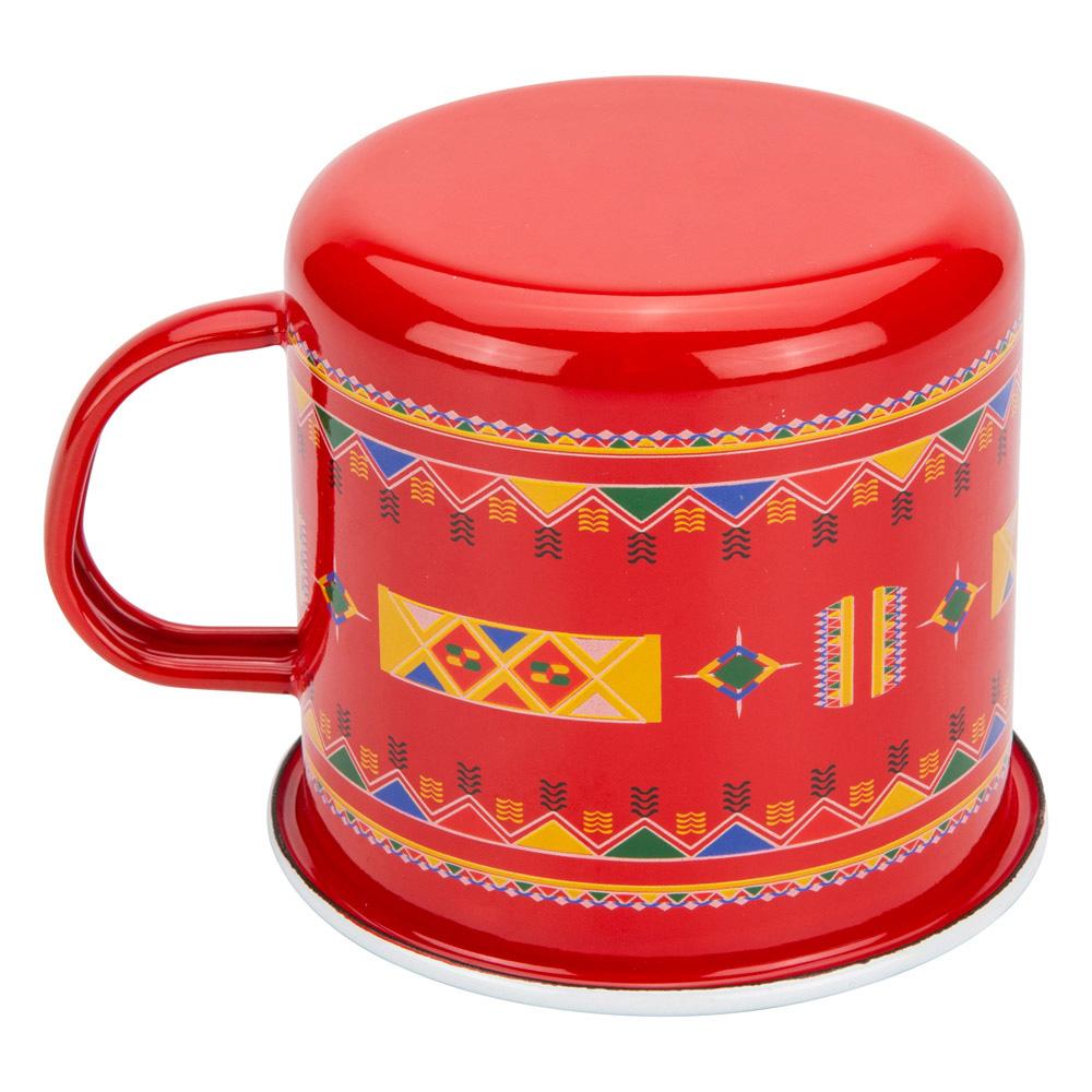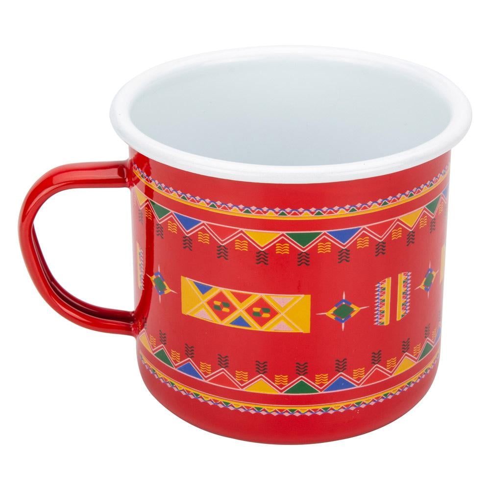 كوب شينكو بنقش عسيري جميل باللون الأحمر، مصنوع من المينا عالي الجودة، يتميز بحجمه الكبير وتصميمه العملي ليضمن لك راحة أثناء شرب القهوة أو الشاي.