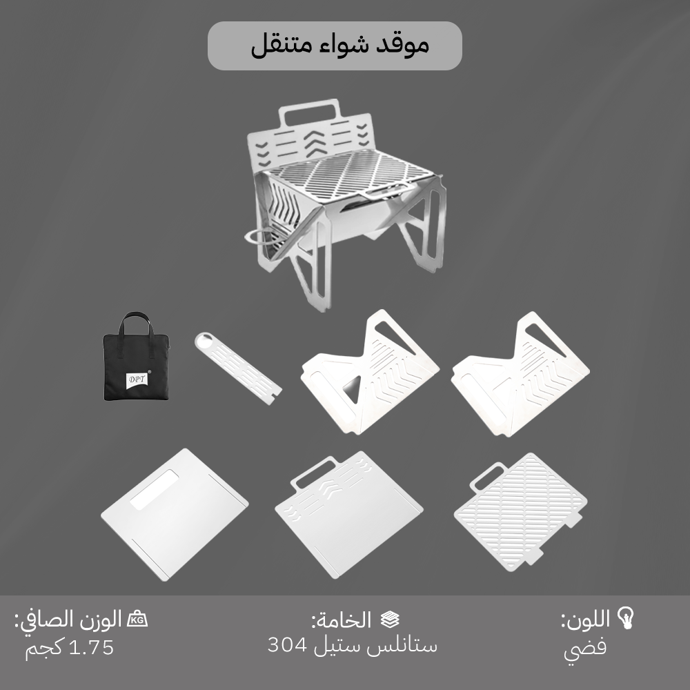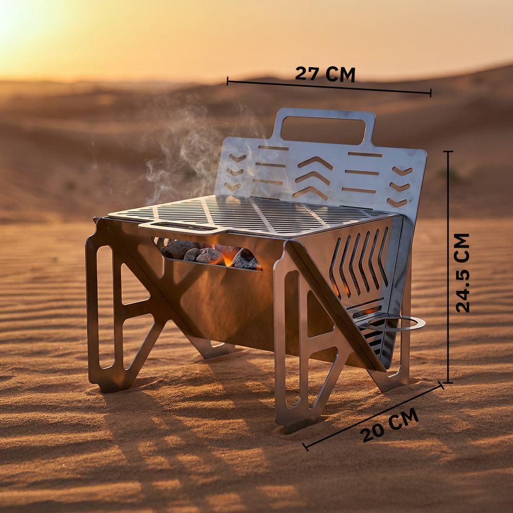 Folding BBQ Grill (Model DPS-0071). It measures 27cm L x 20cm W x 24.5cm H. The material is 304 stainless steel in silver, and the total weight is 1.75kg. It features a foldable design for space-saving and easy portability. Versatile for heating coffee, tea, milk, and grilling, it has a wide range of uses. Made of high-quality stainless steel, it is durable.