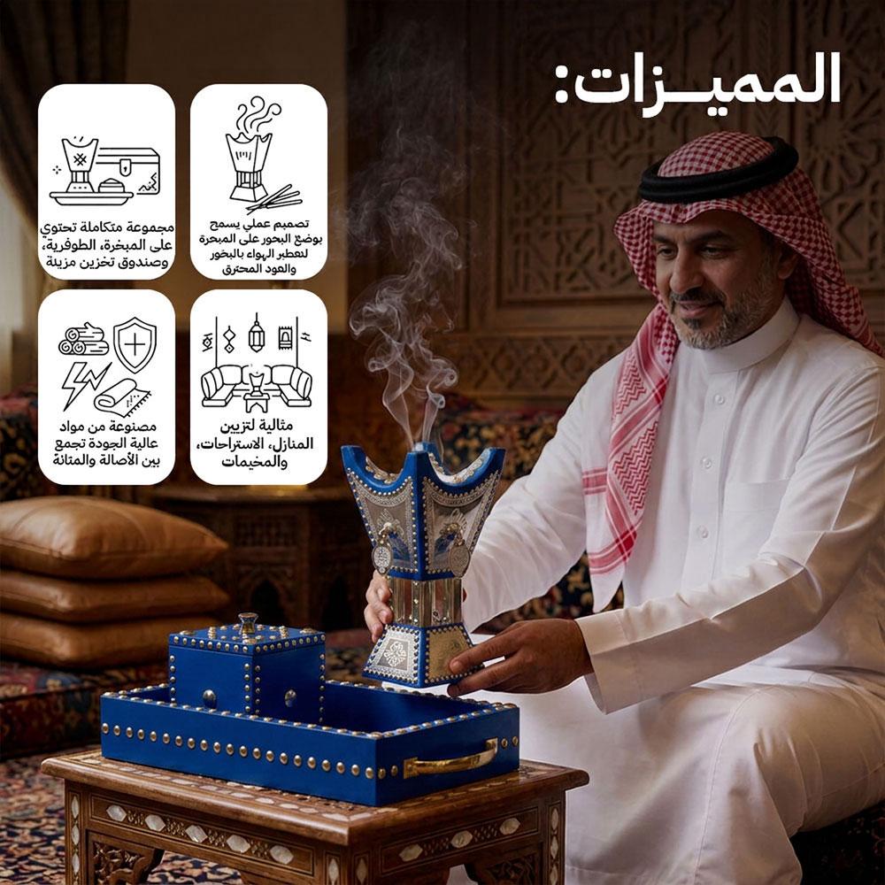 مجموعة متكاملة تحتوي على المبخرة، الطوفرية، وصندوق تخزين مزينة بتصميم تراثي فاخر ومتين.