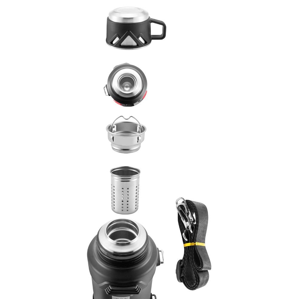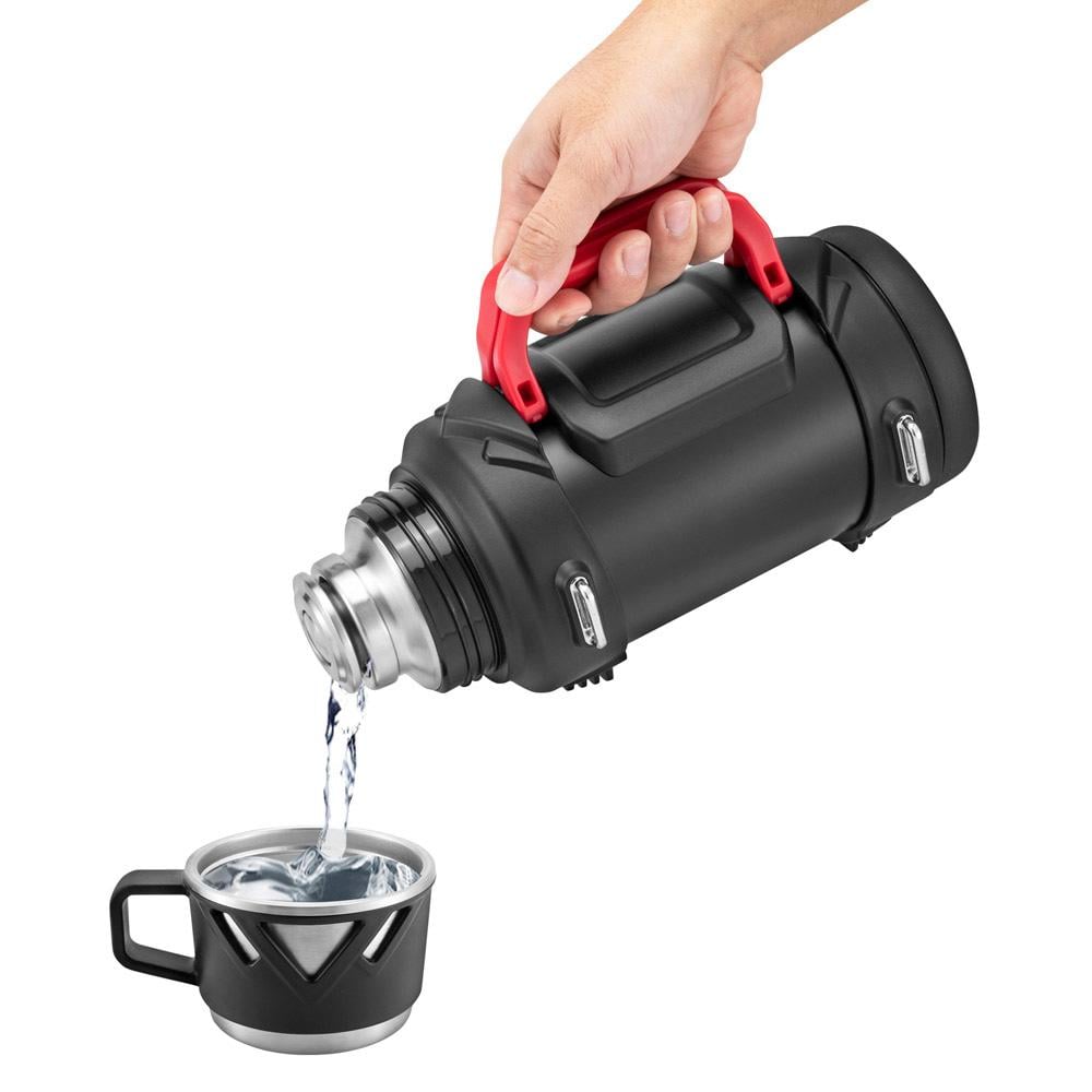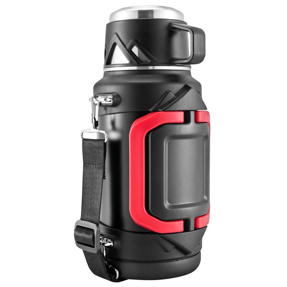 ترمس عالي الجودة يجمع بين المتانة والأداء العالي مع عزل مزدوج للحفاظ على حرارة مشروباتك أو برودتها لفترات طويلة، مزود بمقبض أحمر مريح وحزام علاقى عملي.