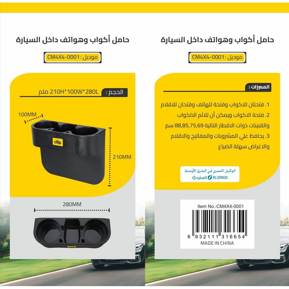 نظّم مساحات سيارتك بكفاءة مع حامل الأكواب والهواتف متعدد الاستخدامات موديل CM4X4-0001 من CMP، الذي يوفر لك تنظيمًا مثاليًا لأغراضك داخل السيارة.
