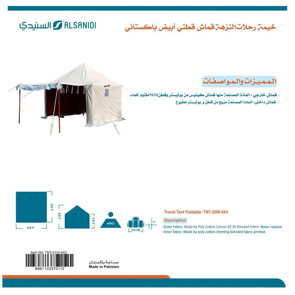 خيمة رحلات النزهة من السنيدي، خيمة قماش قطني أبيض باكستاني مبطنة، تجمع بين الجودة والمتانة لتوفير راحة وحماية مثالية أثناء التخييم والرحلات الخارجية.
