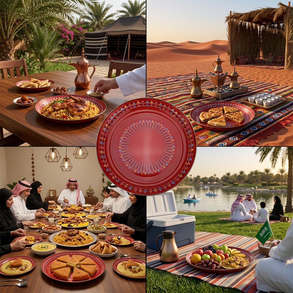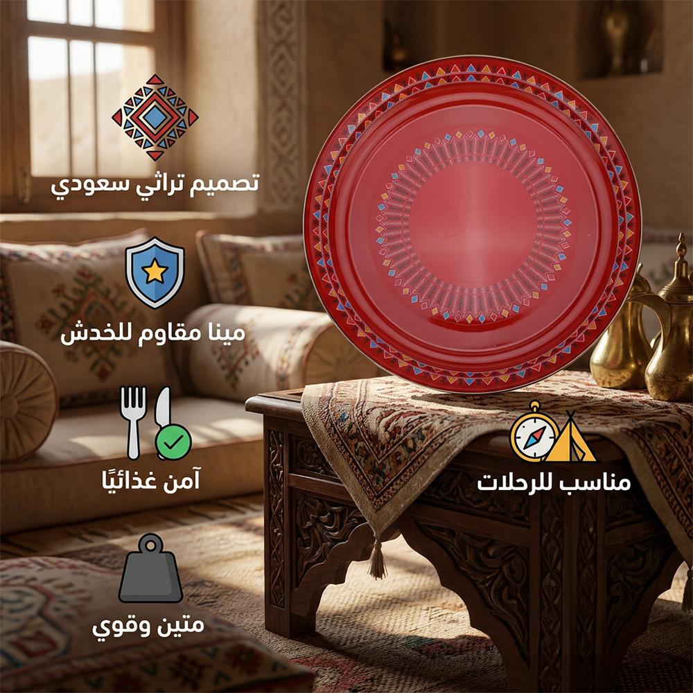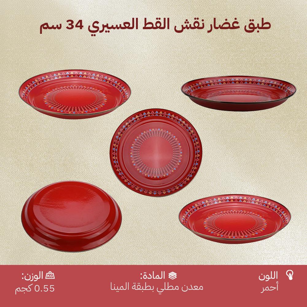 طبق الغضار من السنيدي المزين بنقشة القط العسيري التراثية، مصنوع من معدن مطلي بطبقة المينا عالية الجودة، مثالي للاستخدام اليومي وفي الرحلات البرية.