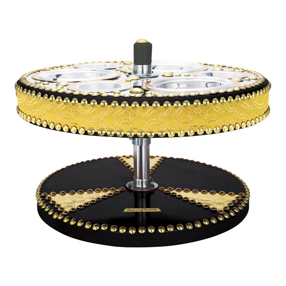 طقم ضيافة تراثي خشبي دائري أسود بقاعدة متحركة مع صحون السنيدي يجمع بين الأصالة والتراث الخليجي الأصيل مع جودة التصنيع العالية ليضفي لمسة فخمة على تقديم ضيافتك.