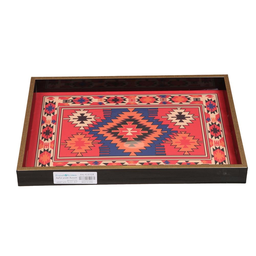 صينية تقديم خشب تراثية من السنيدي بتصميم مستطيل يعكس جمال الثقافة الخليجية الأصيلة، تجمع بين المتانة وخفة الوزن لتقدم تجربة ضيافة راقية وأنيقة.