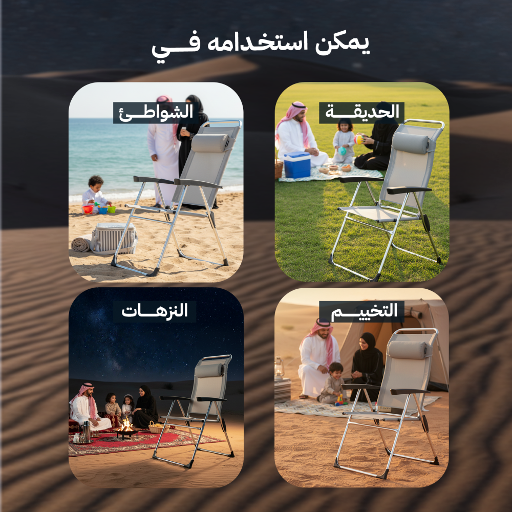 مثالي للرحلات، التخييم، النزهات، الشواطئ، أو حتى الجلوس في الحديقة. كرسي عملي يضمن لك الراحة أينما ذهبت.