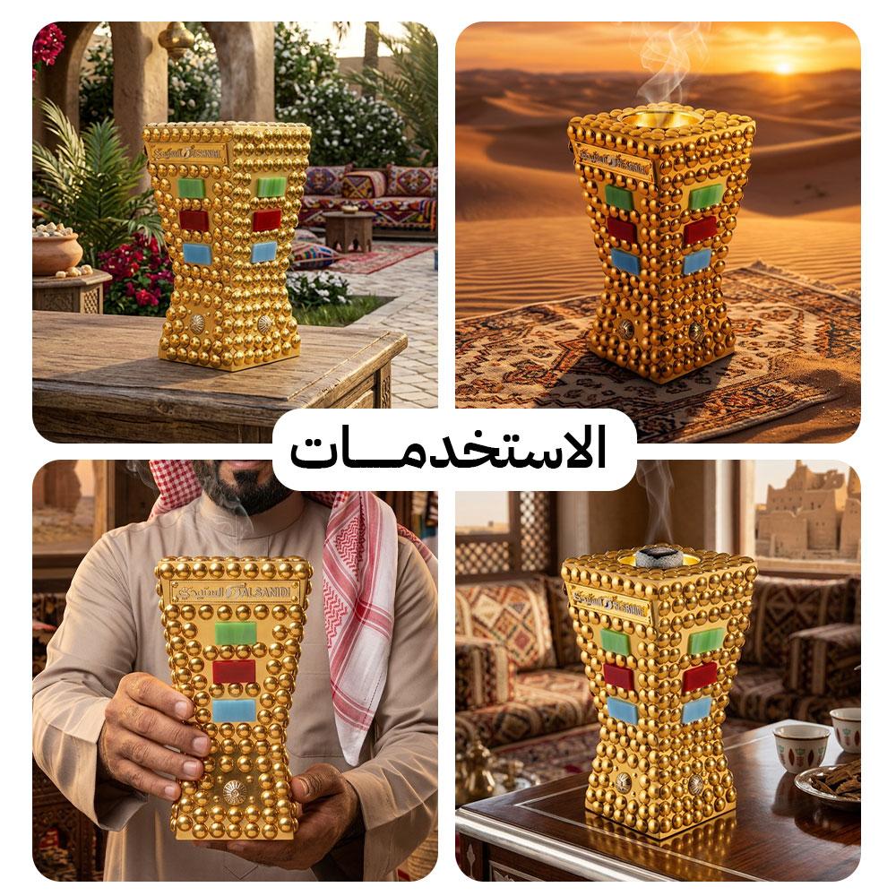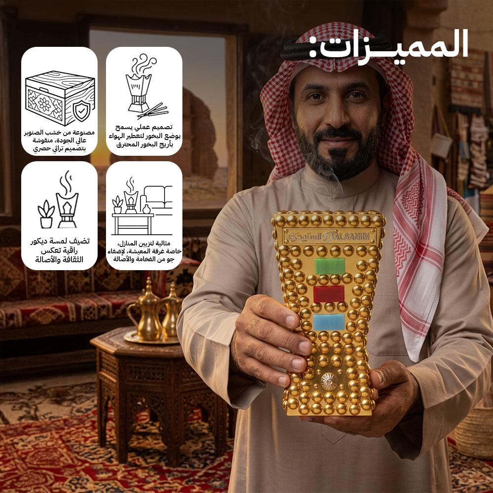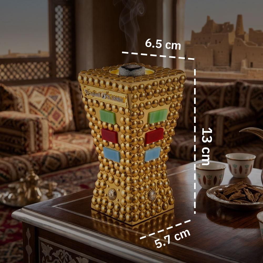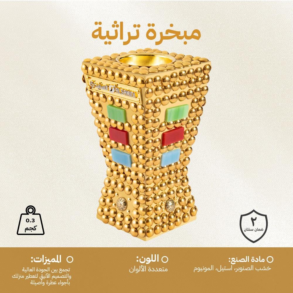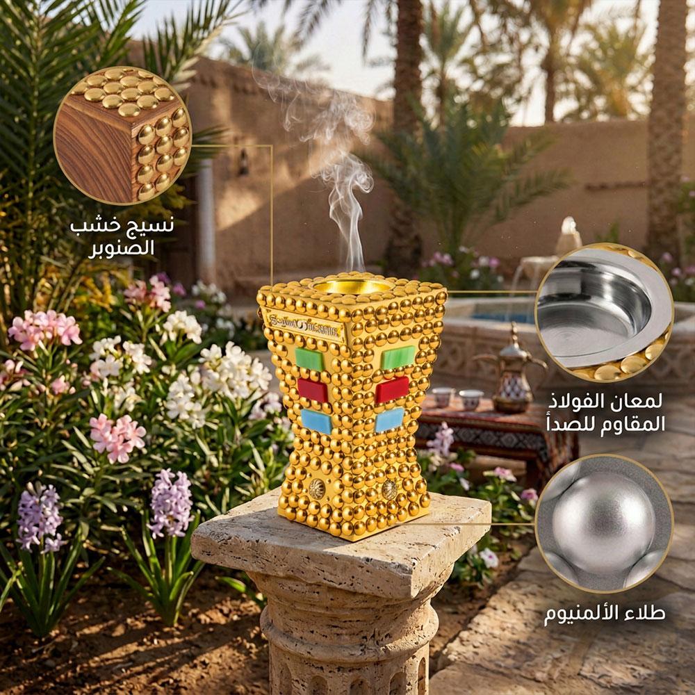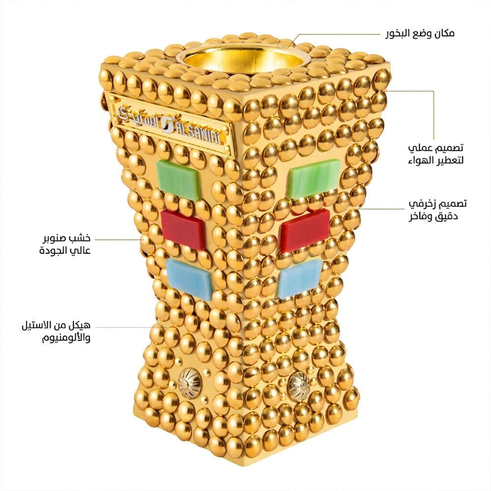 مبخرة ذهبية خشبية مع ديكور معدني ملون من السنيدي، تجمع بين الأصالة والفخامة لتعطير وتزيين منزلك بأناقة.