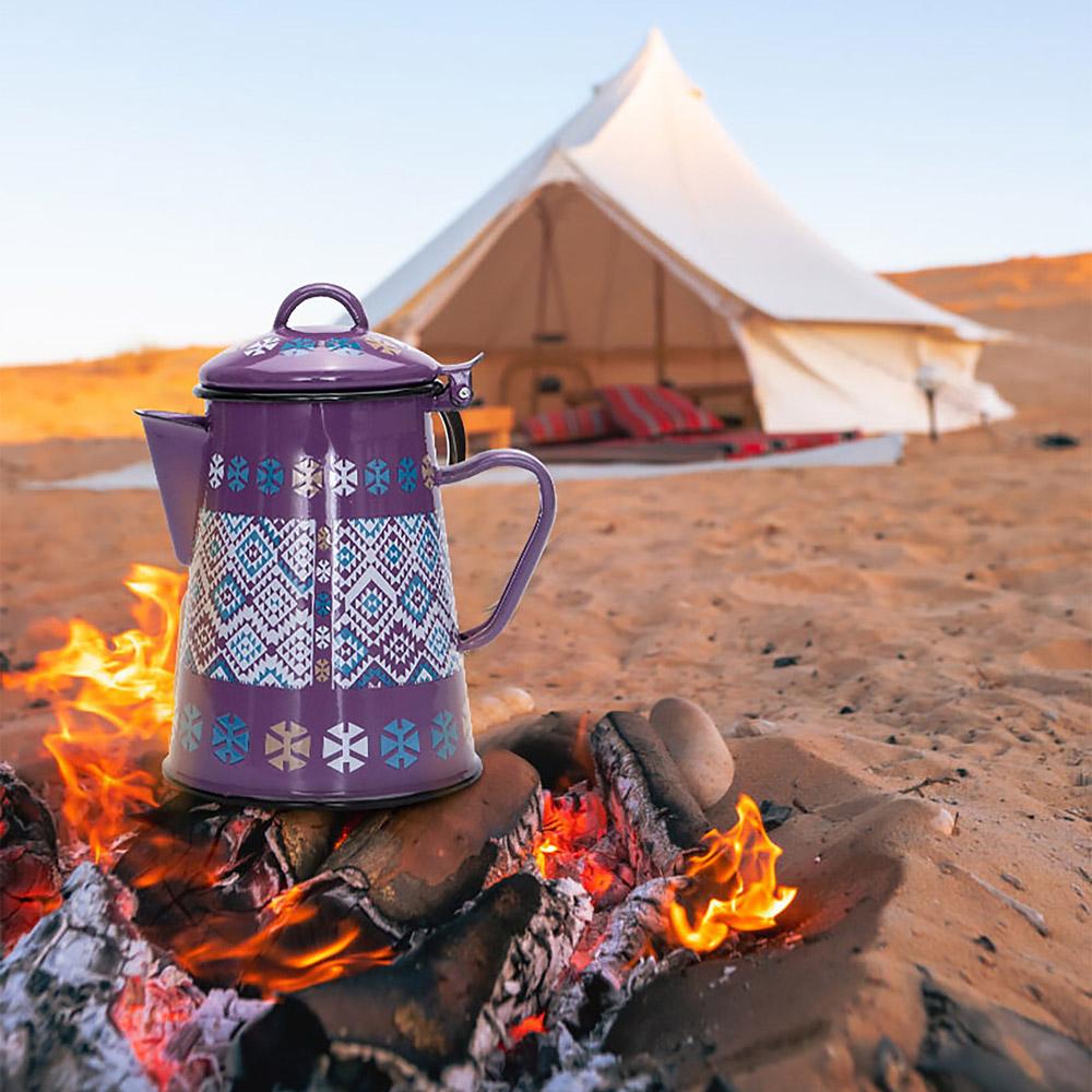 استمتع بتحضير وتقديم مشروباتك الساخنة بدلة الغضار البنفسجية المصنوعة من الإيناميل، بلمسة جمالية تقليدية وجودة عالية تناسب الاستخدام اليومي والرحلات.