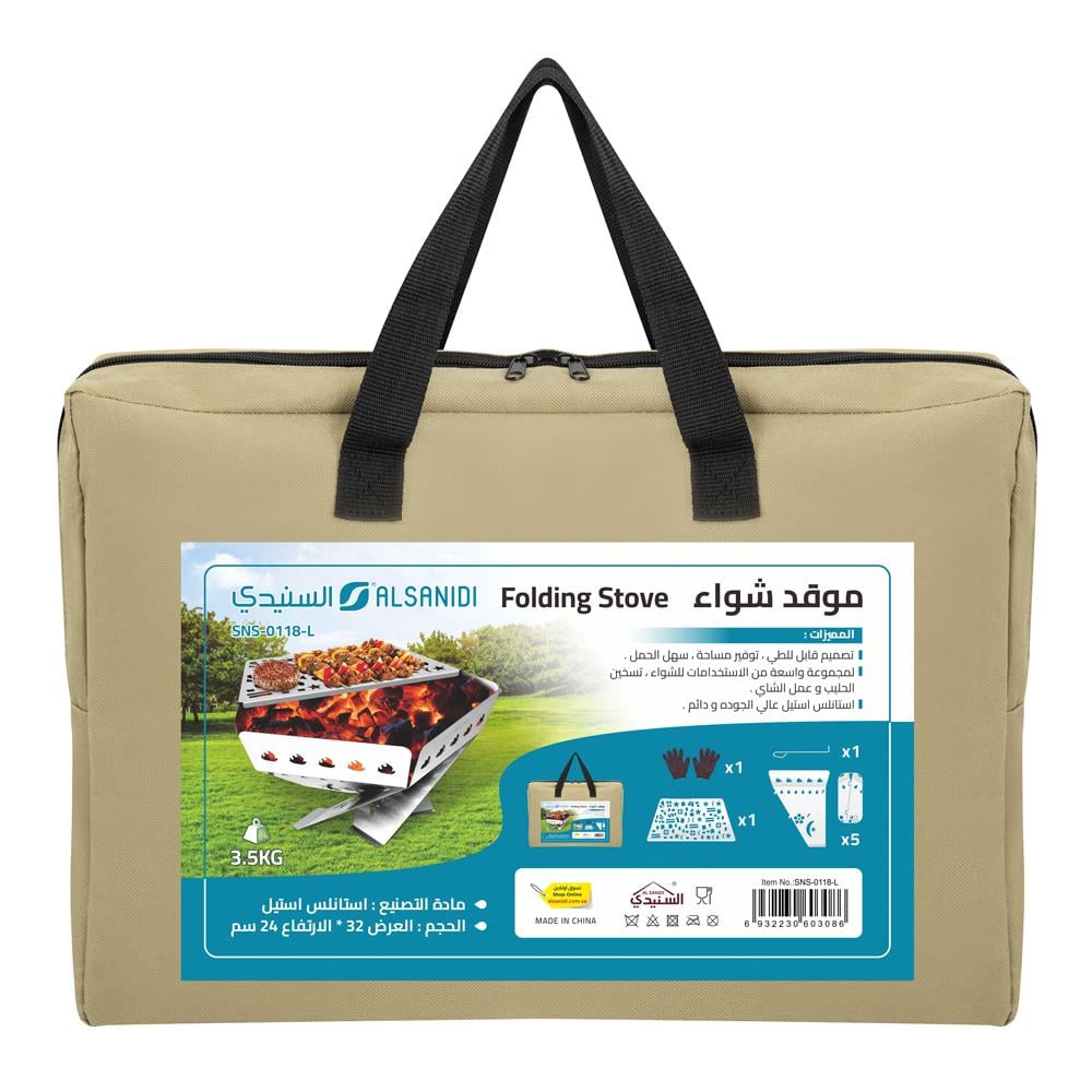 موقد شواء (الموديل SNS-0118-L). يأتي بحجم العرض 32 سم × الارتفاع 24 سم باللون الفضي. مادة التصنيع هي ستانلس ستيل ويبلغ إجمالي الوزن 3.5 كجم. يتميز بتصميم قابل للطي لتوفير مساحة وسهل الحمل، ومجموعة واسعة من الاستخدامات للشواء وتسخين الحليب وعمل الشاي، ومصنوع من ستانلس ستيل عالي الجودة ودائم.
