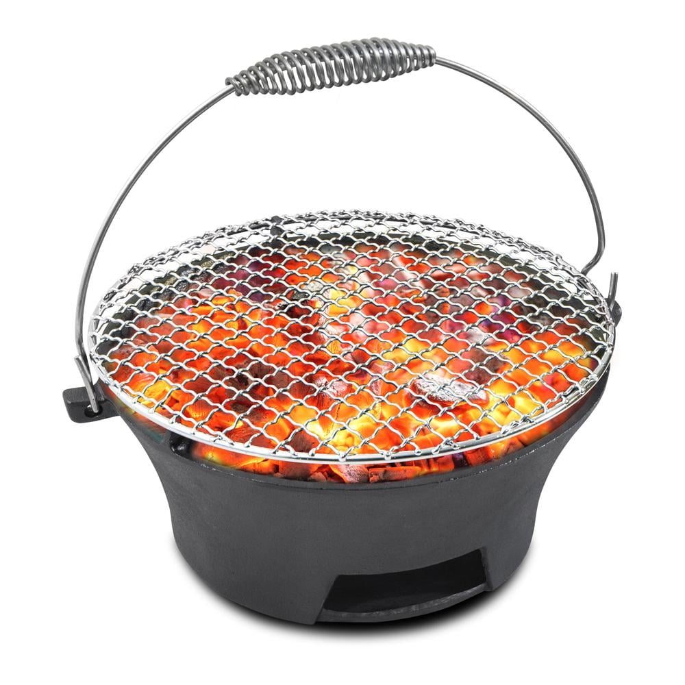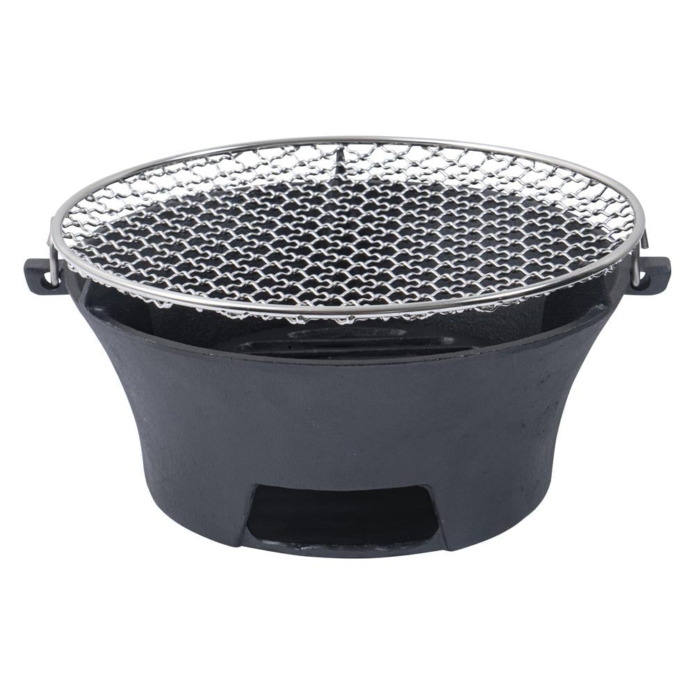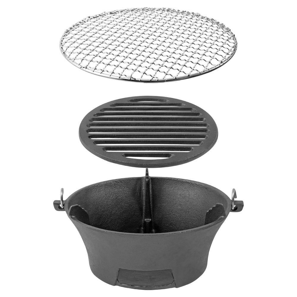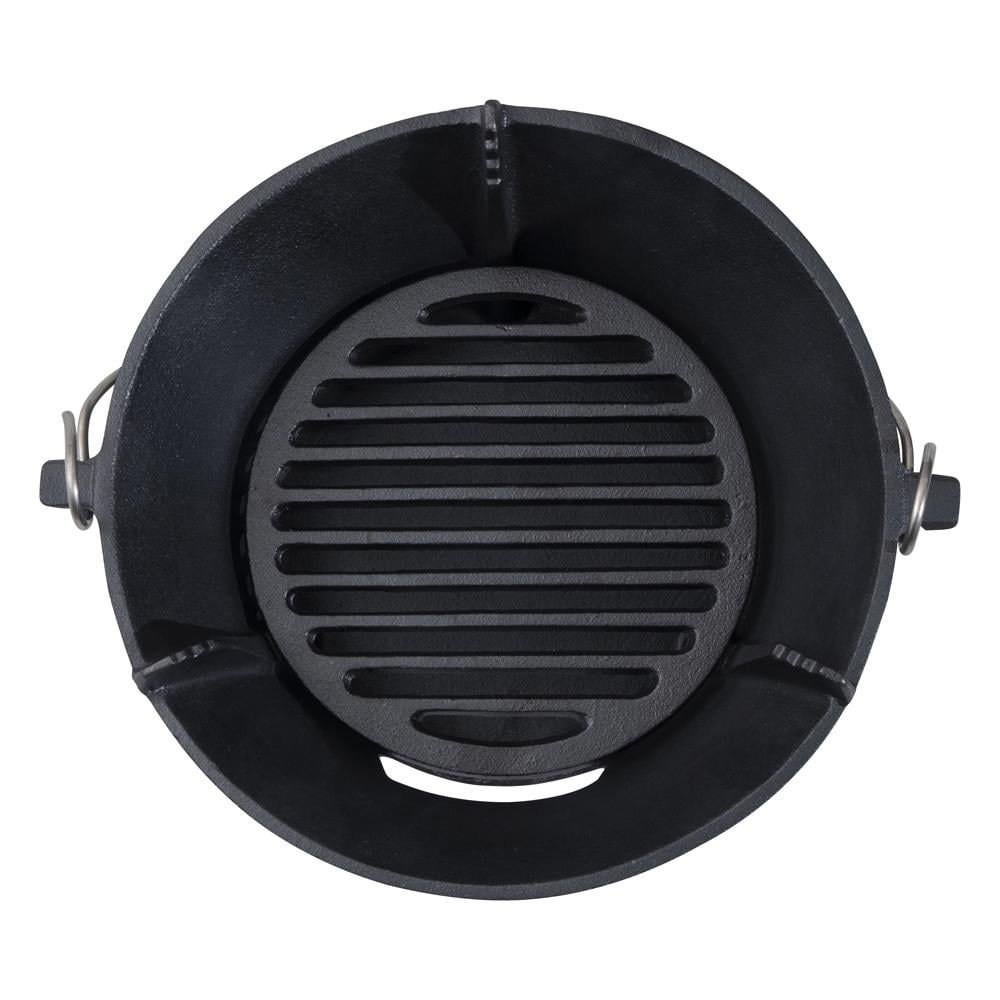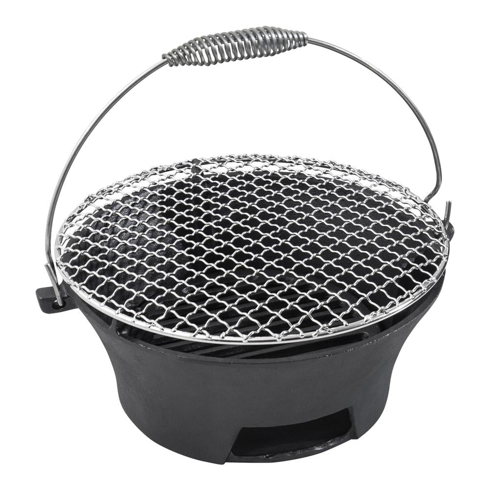 موقد مع شواية رحلات (الموديل SNS-0117). يأتي بحجم القطر 25.5 سم × الارتفاع 11.2 سم ويبلغ وزنه 3.86 كجم. مادة التصنيع للمقبض هي سلك استيل، والموقد مصنوع من حديد زهر، وشبك الشواء من ستانلس ستيل. يمكن استخدام جهتي الشبك.