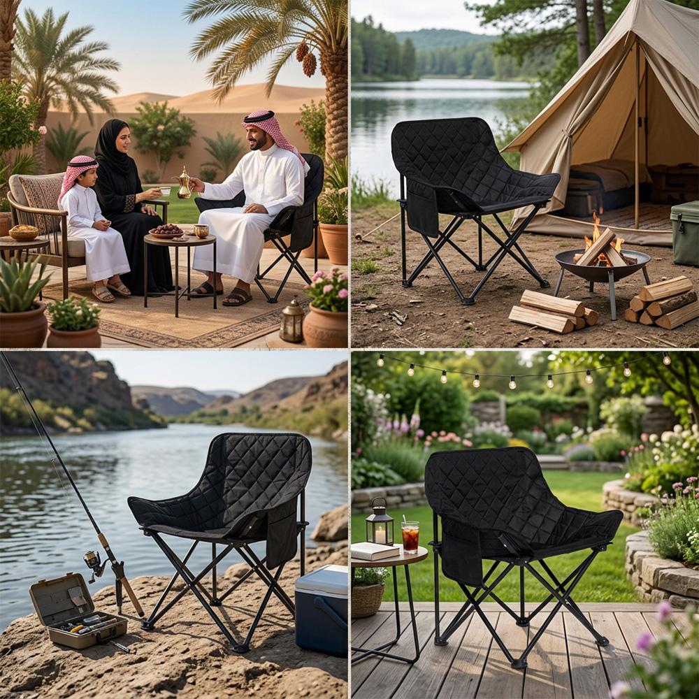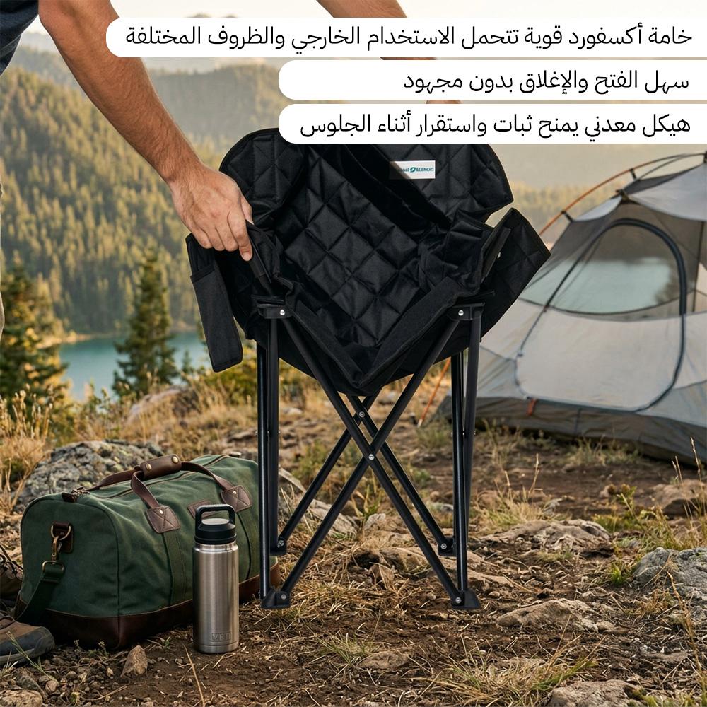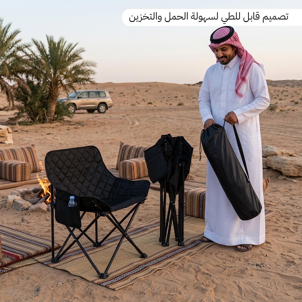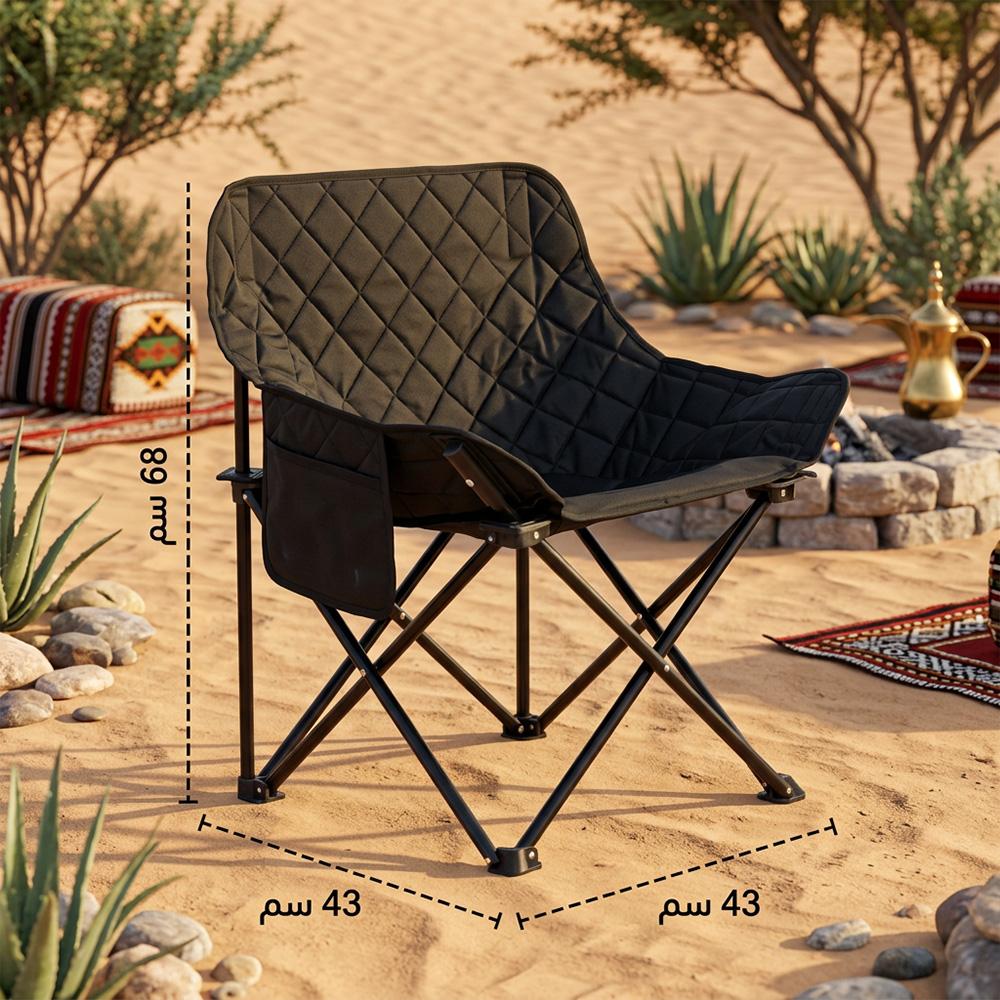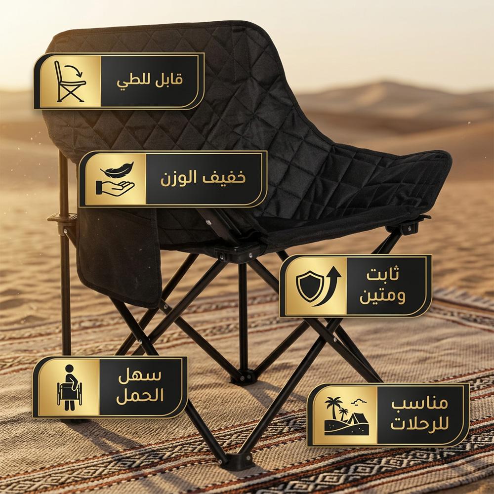 هنا الكرسي اللي يفهم معنى الراحة في البر… تصميم عملي ينفتح بسرعة ويثبتك في جلسة هادئة بدون تعقيد، وكأنه يقولك: اجلس وخل الباقي علينا.