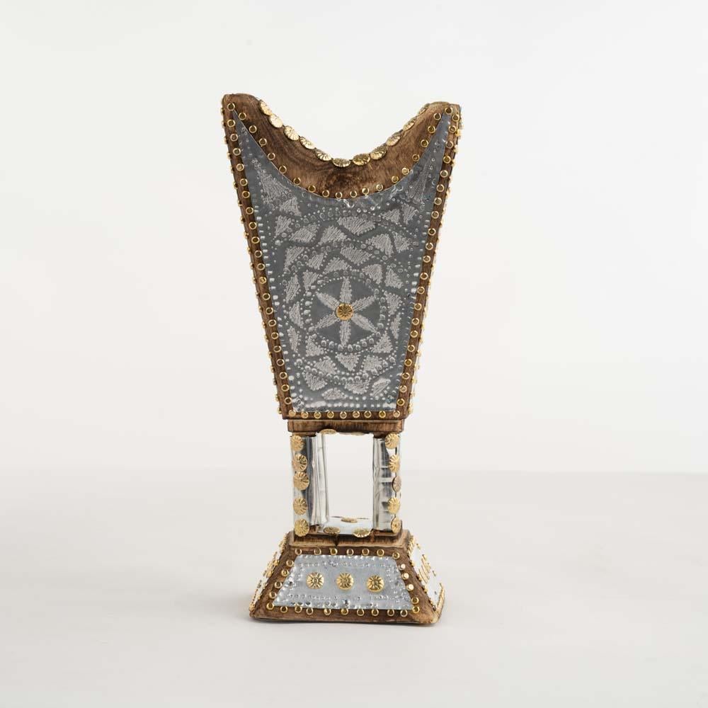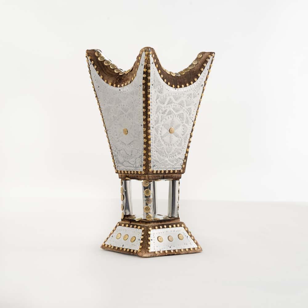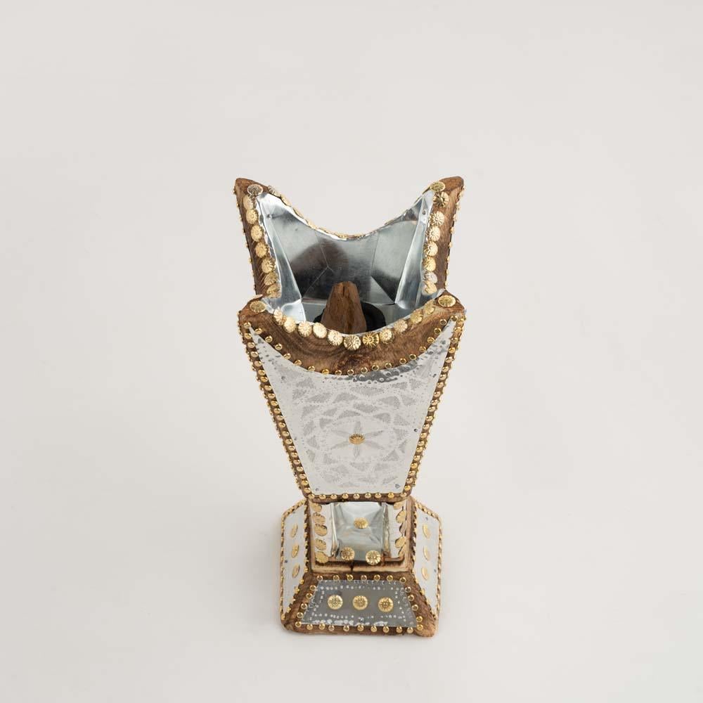 Combining the durability of natural wood with the luxury of metal decorated with elegant artistic motifs, it is a sophisticated decorative piece and an ideal way to diffuse the scent of incense throughout the room in a luxurious style.