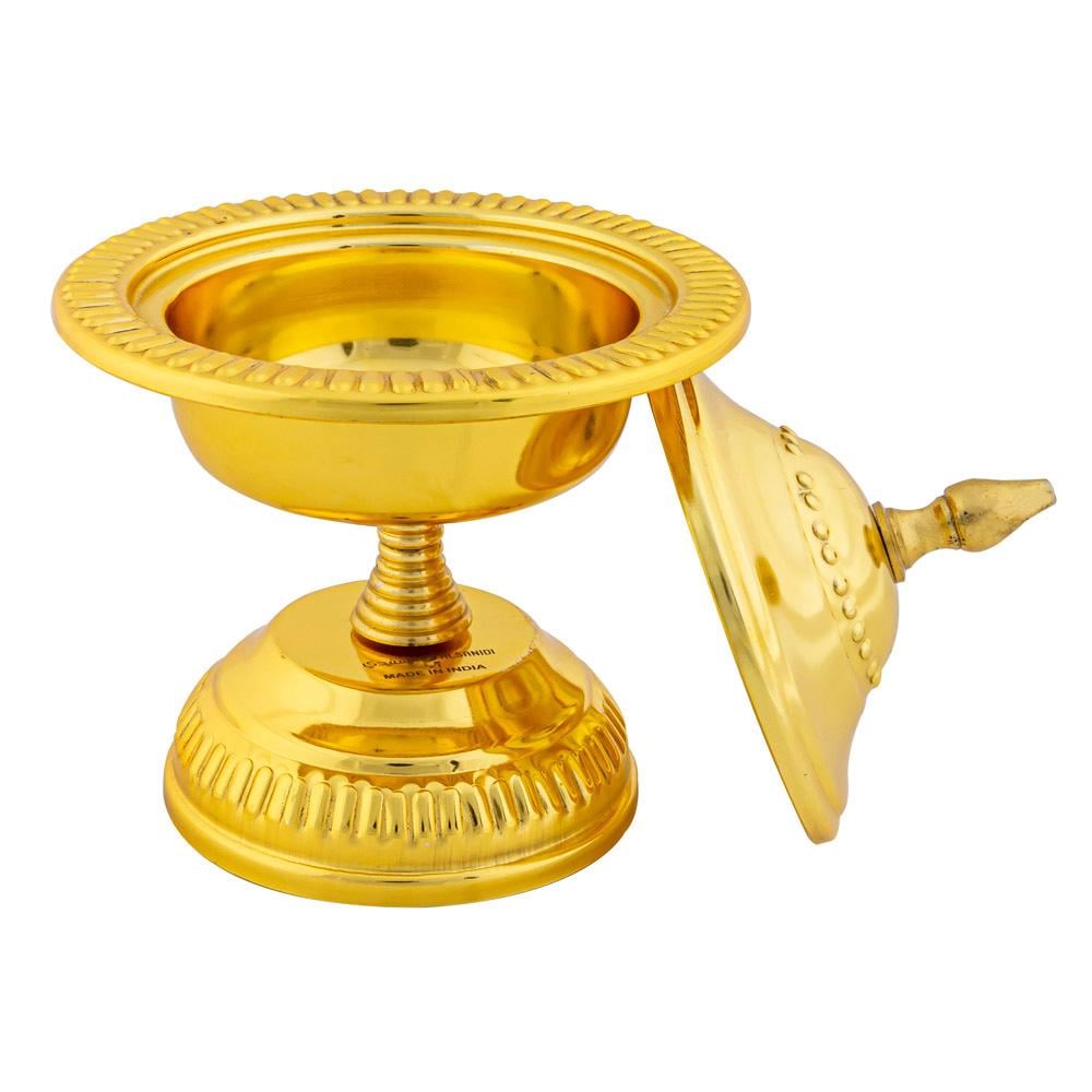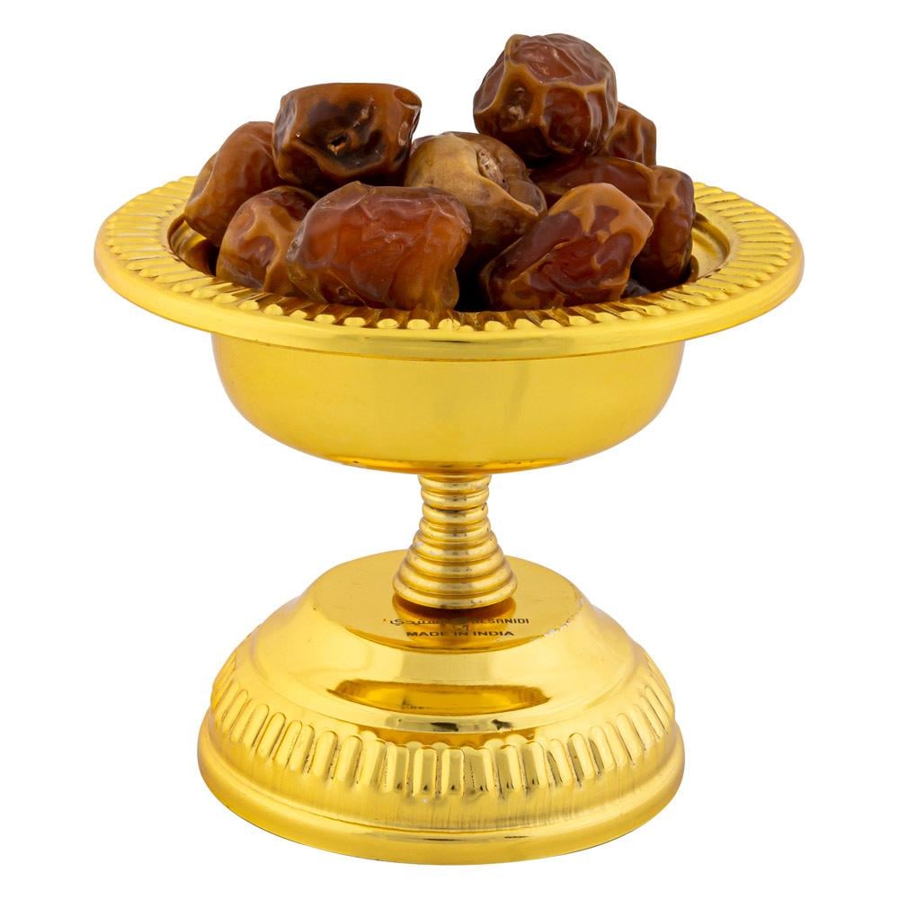 An elegant date bowl made of high-quality Indian brass. Its classic design with a raised base and lid makes it both practical and beautiful.
