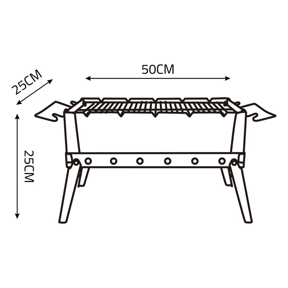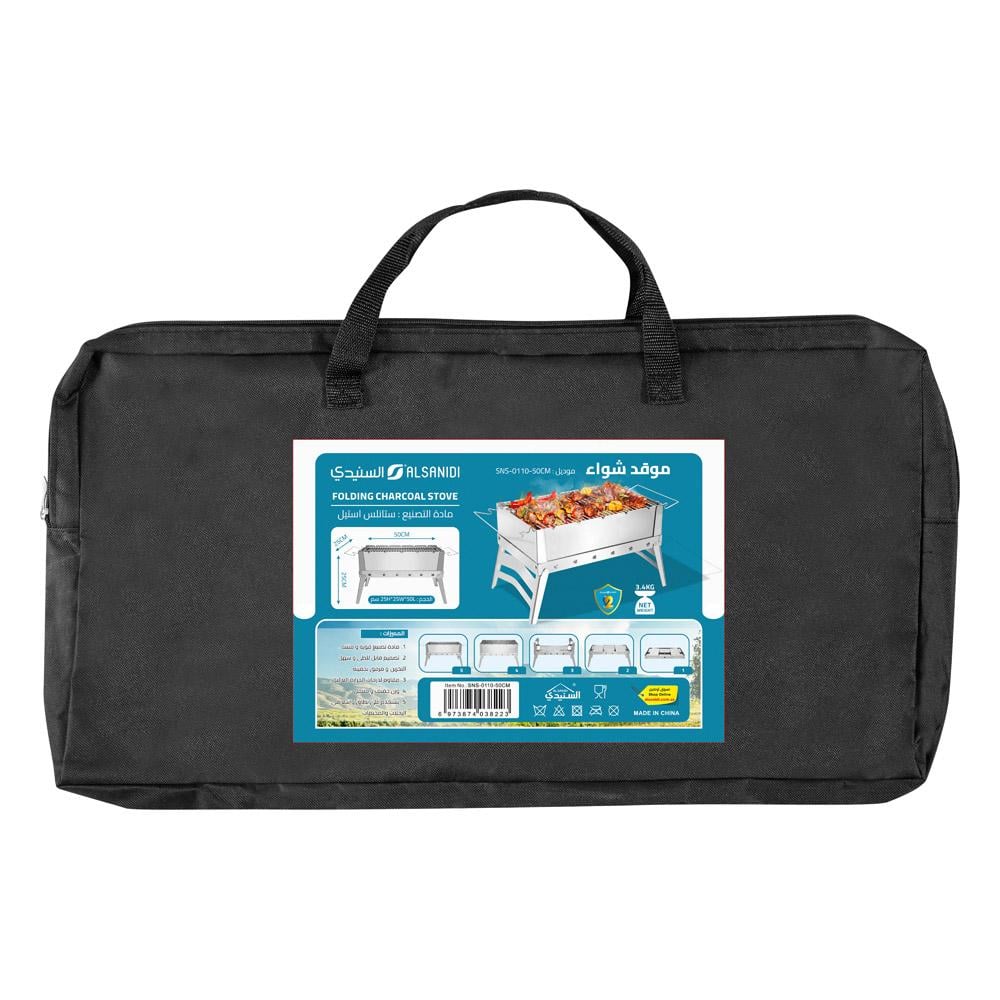 Collapsible stainless steel barbecue grill (model SNS-0110-50CM). It measures 50 x 25 x 25 cm and is silver in color. It is made of stainless steel and weighs 3.4 kg. It features a strong and durable construction, a foldable design for easy storage, and a carrying case. It is high temperature resistant, lightweight, and portable, making it widely used for camping and travel.