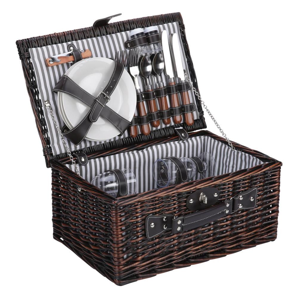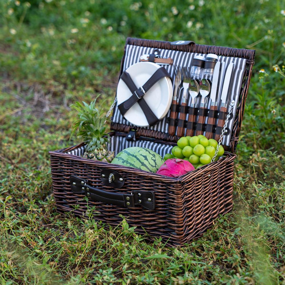Perfect for picnics and trips: Stylish and practical wicker bag that holds all the essentials for outdoor dining.