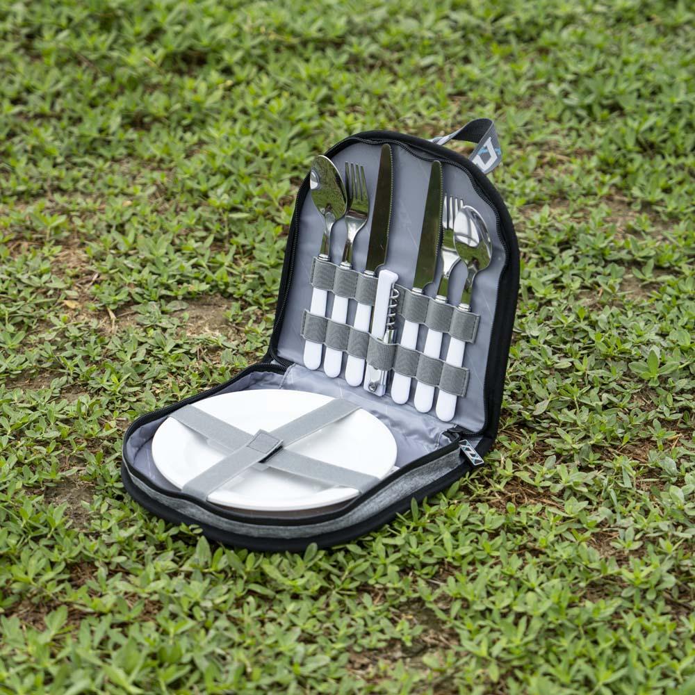 Bag Contents : 2 forks, 2 spoons, 2 knives, 2 dinner plates, 1 bottle opener.